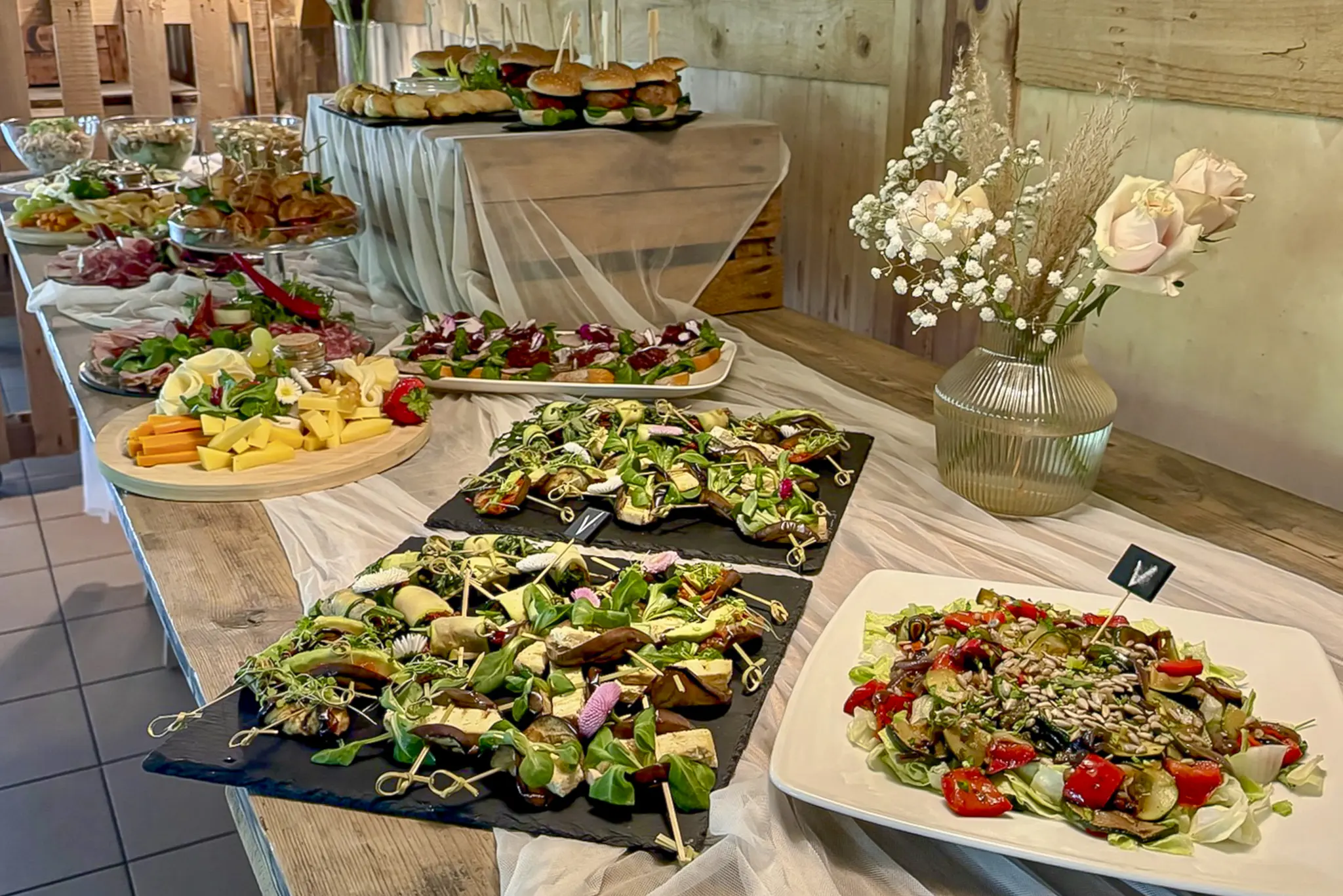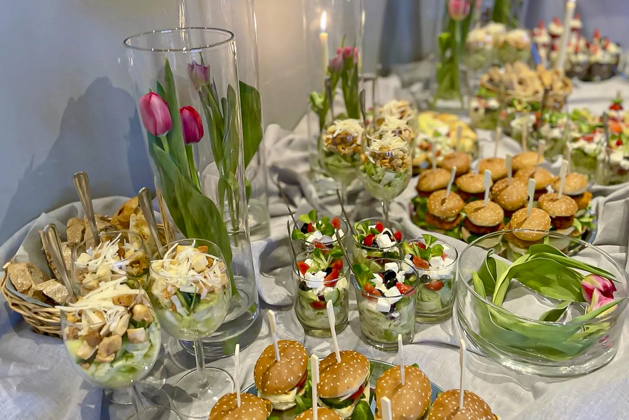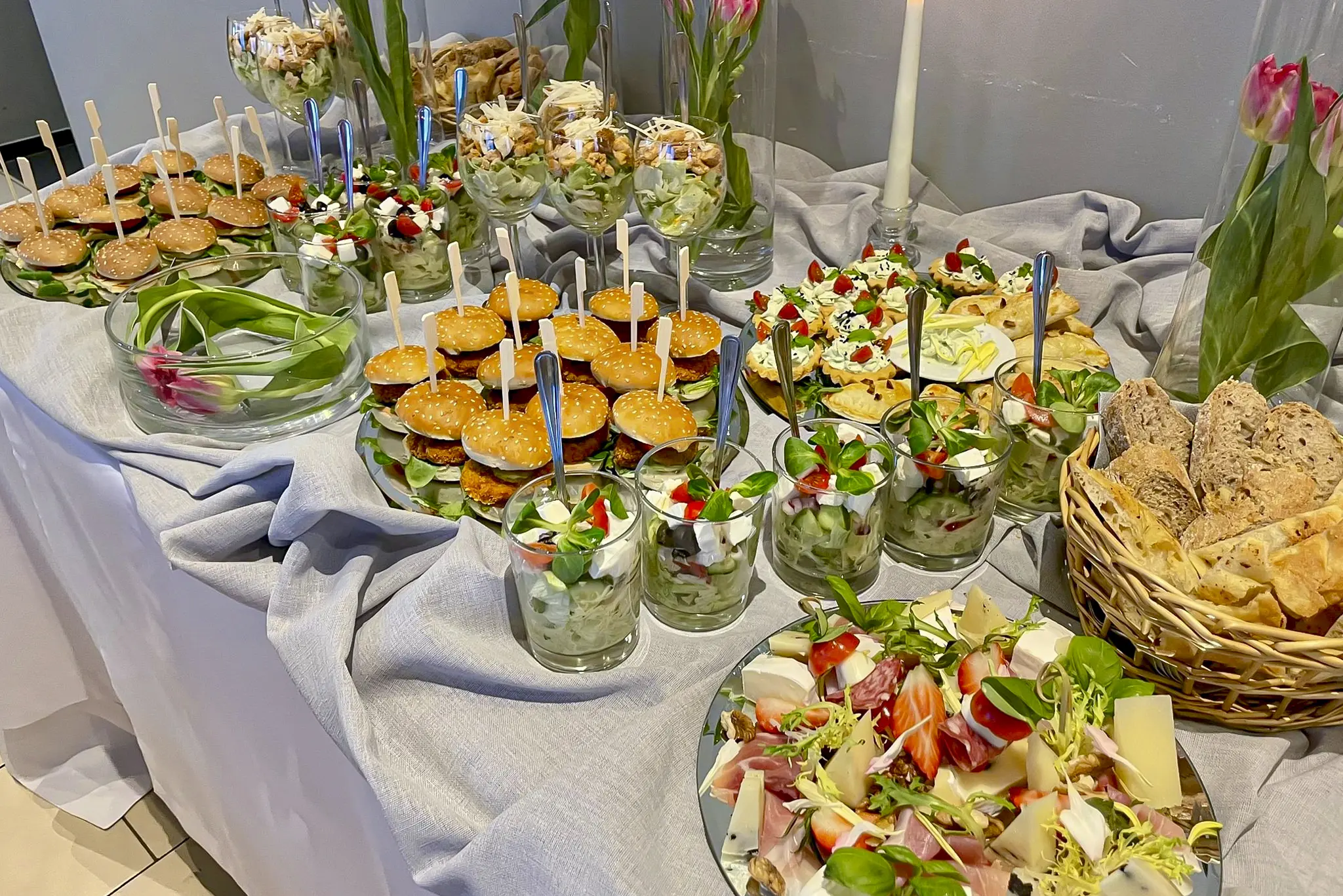 Serwujemy wykwintne menu w formie bufetu szwedzkiego, który dostarczamy wraz z elegancko udekorowanymi stołami. Zapewniamy pełne przygotowanie – od stylowych obrusów i świeżych kwiatów, po estetyczne rozmieszczenie potraw, które nie tylko smakują wyśmienicie, ale również zachwycają swoim wyglądem. W menu znajdziesz szeroki wybór dań – od klasycznych, ciepłych potraw, przez finezyjne przystawki i finger food.